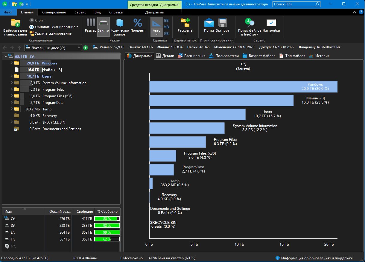 Графическое представление содержимого дисков обеспечивает быстрый анализ используемого пространства. Кроме обычного отображения дерева каталогов,